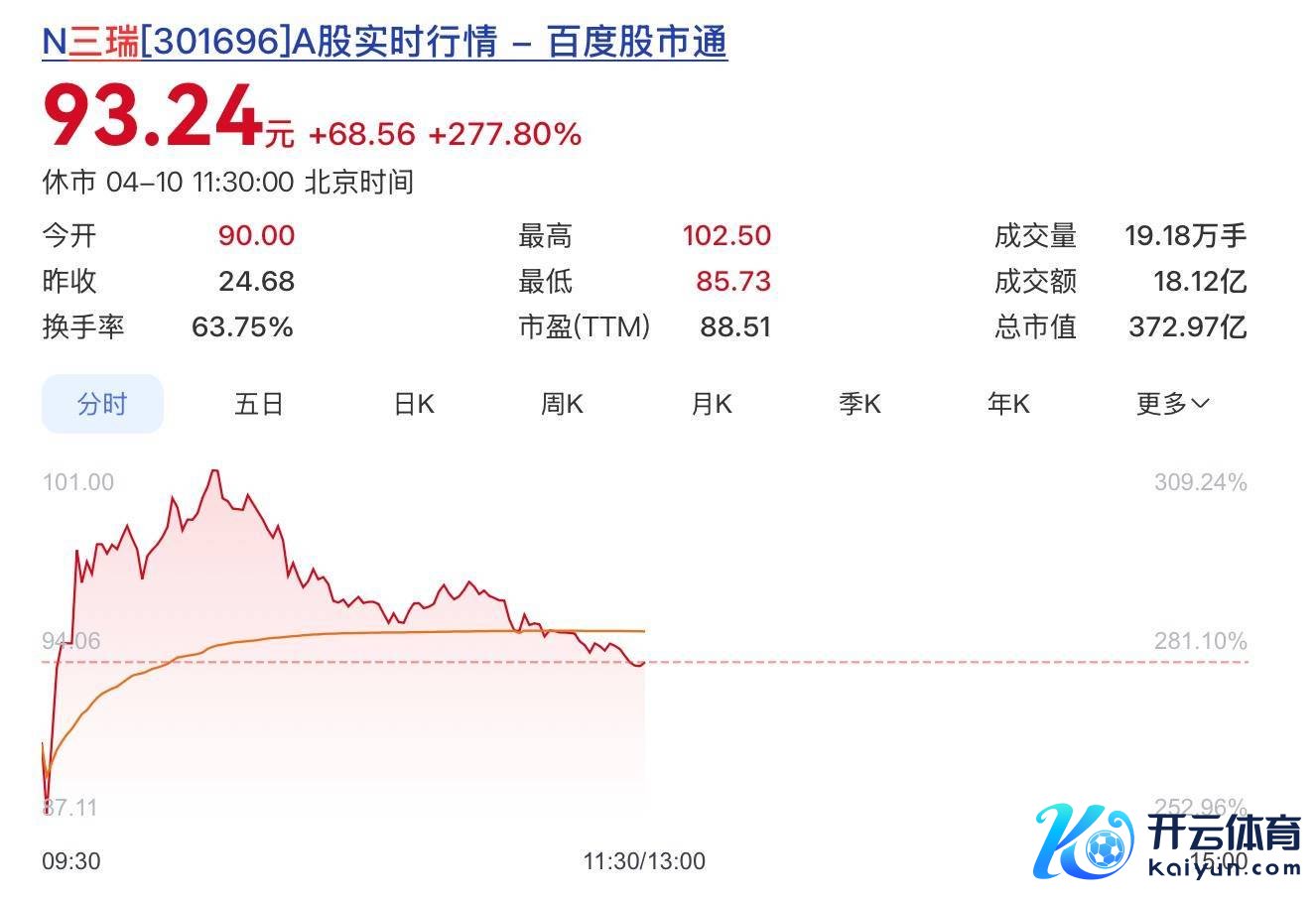 本日开盘,三瑞智能报90元较刊行价24.68元大涨264.67%,对应市值约360.01亿元,盘中最高波及102.5元。罢休午间休市,其股价涨277.8%报93.24元,总市值372.97亿元。
